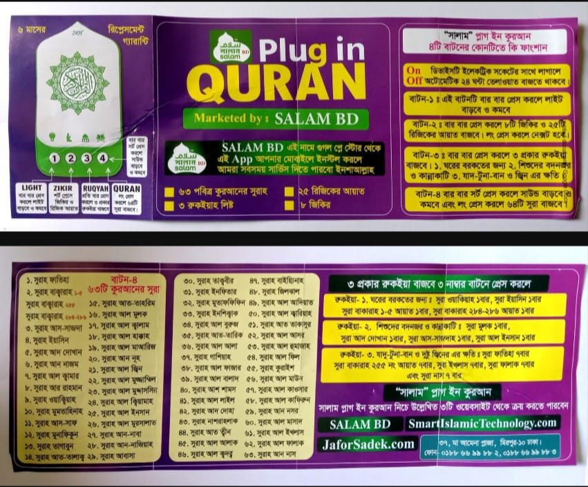 'প্রতি প্লাগিন কুরানের সাথে থাকবে ফ্রি ১০টি দোয়ার স্টিকার শায়েখ আহমাদুল্লাহ সাহেবের আস সুন্নাহ ফাউন্ডেশনের একটি রুকইয়া গাইডলাইন লিফলেট।